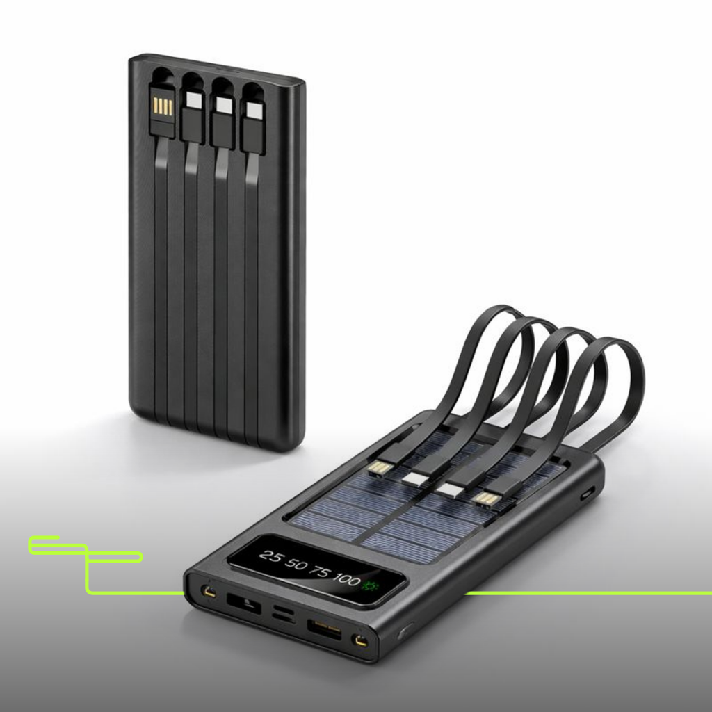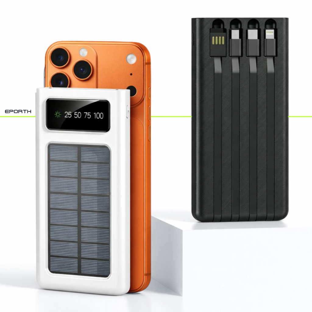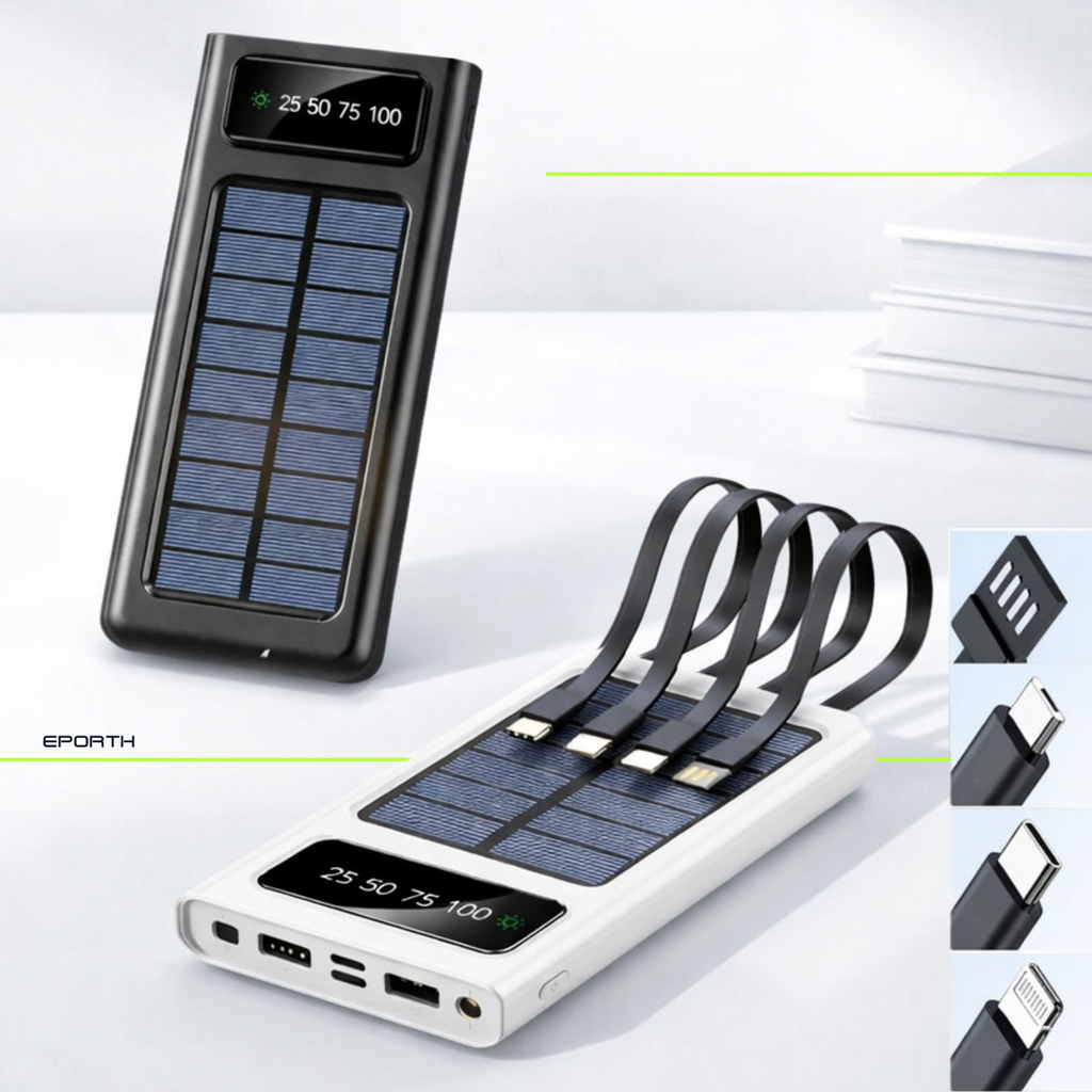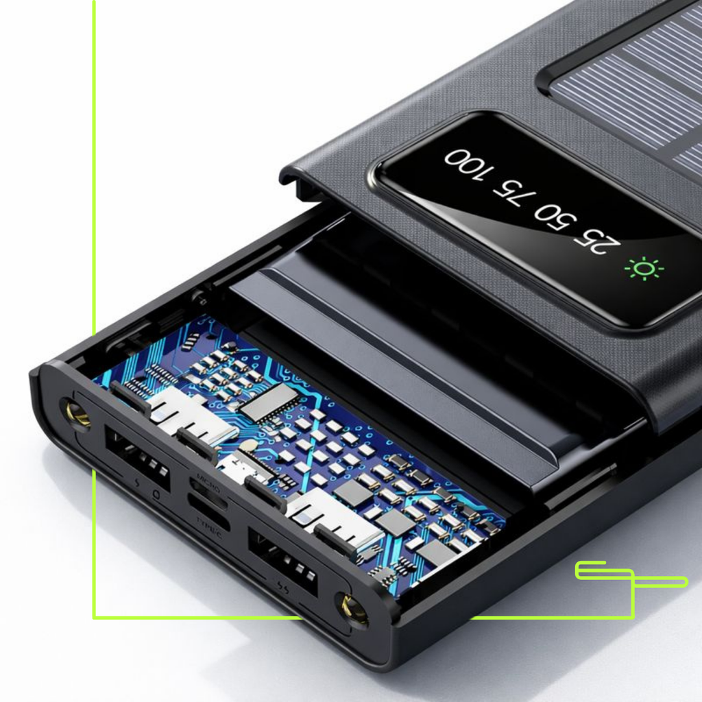 O banco de energia possui um painel solar integrado atualizado que carrega automaticamente quando exposto à luz solar. Isso garante que seu dispositivo esteja sempre carregado, mesmo quando estiver ao ar livre.