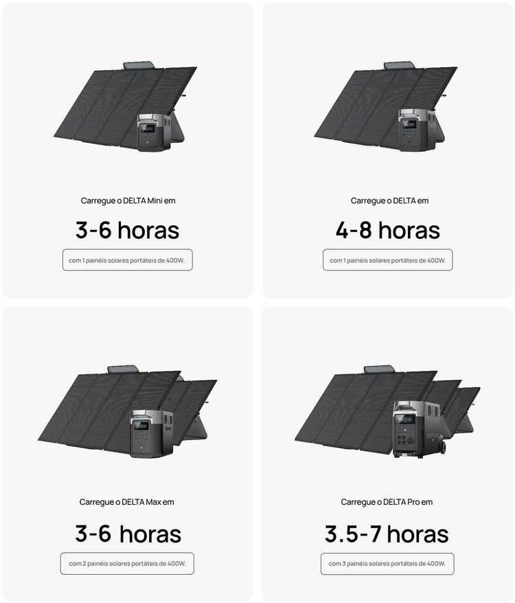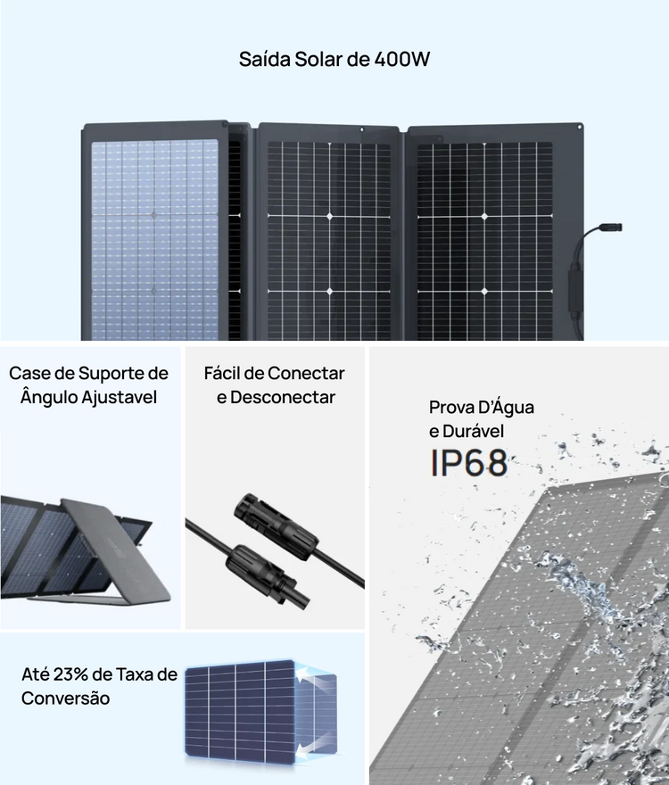 Nosso painel solar portátil de 400 W oferece produção solar e classificação de eficiência de conversão elevadas e um design dobrável conveniente para que esteja pronto para ser usado a qualquer momento.