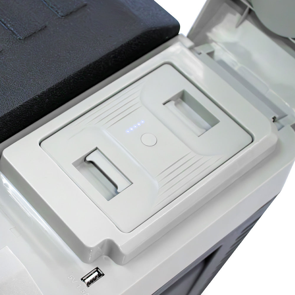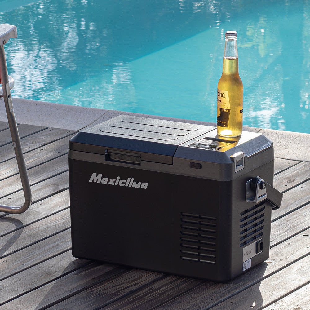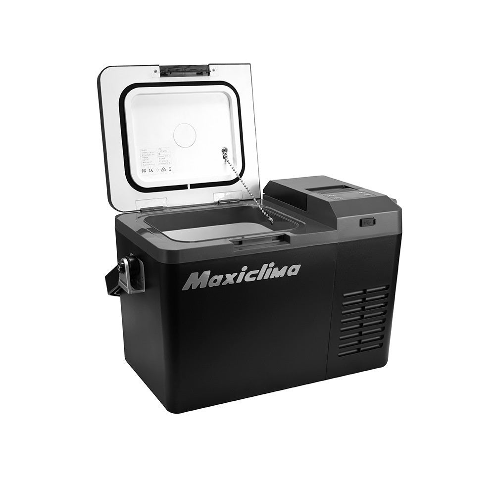 A Geladeira Maxiclima X-Power 9 litros. Possui entrada quadrivolt, luz de LED interna, entrada USB para carregar dispositivos, abridor de garrafas embutido e bateria interna recarregável.